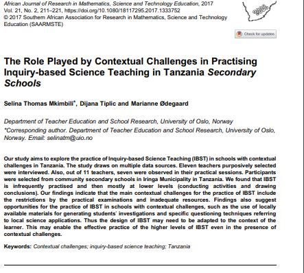 Selina Thomas Mkimbili, Dijana Tiplic & Marianne Ødegaard (2017) The Role Played by Contextual Challenges in Practising Inquiry-based Science Teaching in Tanzania Secondary Schools, African Journal of Research in Mathematics, Science and Technology Education, 21:2, 211-221, DOI: 10.1080/18117295.2017.1333752