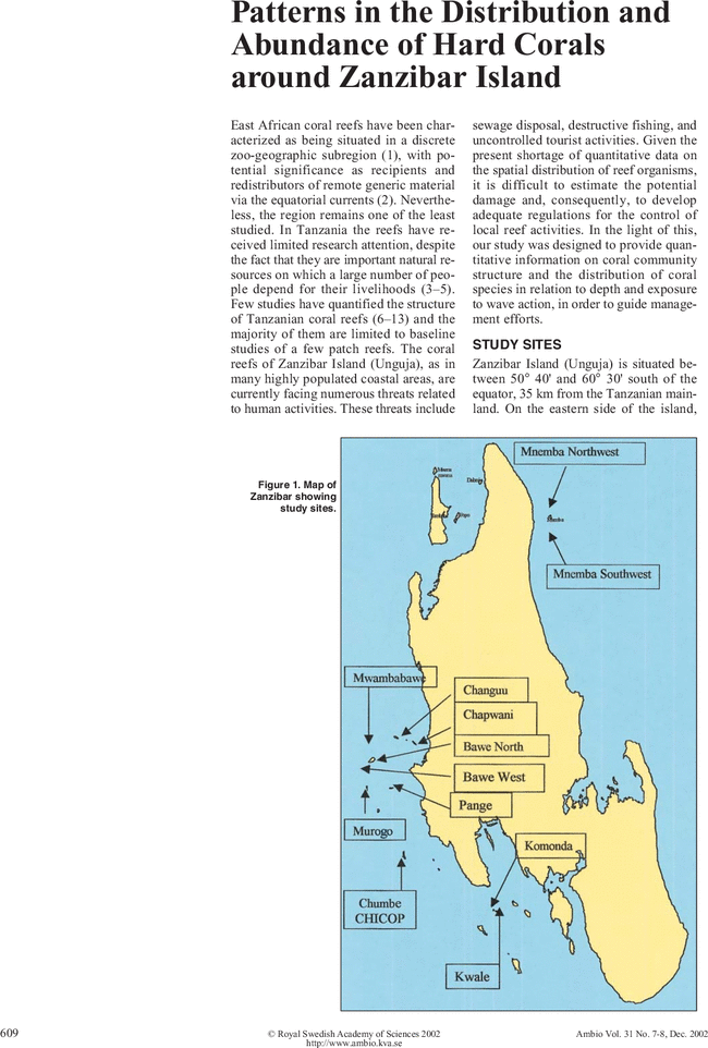 Mbije, N., Wagner, G., Francis, J., Öhman, M., & Garpe, K. (2002). Patterns in the Distribution and Abundance of Hard Corals around Zanzibar Island. AMBIO: A Journal Of The Human Environment, 31(7), 609. http://dx.doi.org/10.1639/0044-7447(2002)031[0609:pitdaa]2.0.co;2