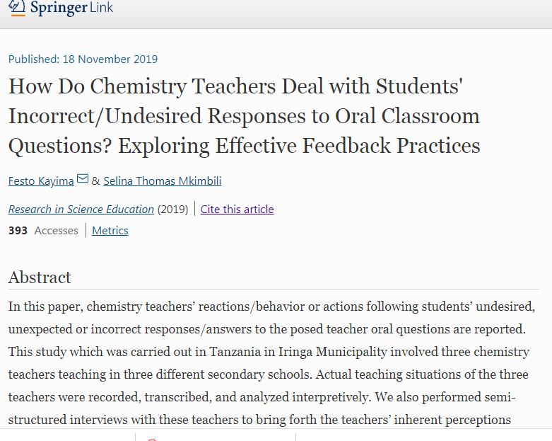 Kayima, F., Mkimbili, S.T. How Do Chemistry Teachers Deal with Students' Incorrect/Undesired Responses to Oral Classroom Questions? Exploring Effective Feedback Practices. Res Sci Educ (2019). https://doi.org/10.1007/s11165-019-09876-y