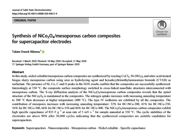 In this study, nickel cobaltite/mesoporous carbon composites are synthesized by reacting CoCl2, Ni (NO3)2 and nitric acid-treated biogas slurry mesoporous carbon using urea as hydrolyzing agent and hexadecyltrimethylammonium bromide (CTAB) as surfactant. The presence of Ni, Co, C and O peaks in the EDX results confirm that the composites are successfully synthesized. Interestingly at 350 °C, the composite surface morphology switched to cross-linked nanoflake structures interconnected with mesoporous carbon. The X-ray diffraction analysis of the NiCo2O4/mesoporous carbon composites reveals that the spinel structure of the NiCo2O4 is maintained in the composites. The nitrogen uptake increases with increasing annealing temperature to 300 °C then decreases at higher temperature (400 °C). The type IV isotherms are exhibited by all the composites. The contribution of mesopores increases with increasing annealing temperature: 32% for BC-NCo-200, 41% for BC-NCo-250, 56% for BC-NCo-300, 66% for BC-NCo-350 and 86% for BC-NCo-400. The NiCo2O4/mesoporous carbon composites exhibit high specific capacitance of 835 F g−1 at scan rate of 5 mV s−1 for sample annealed at 350 °C. The cyclic stabilities of the electrodes are above 90% after 50,000 cycles indicating that the synthesized composites are suitable candidates for supercapacitors.