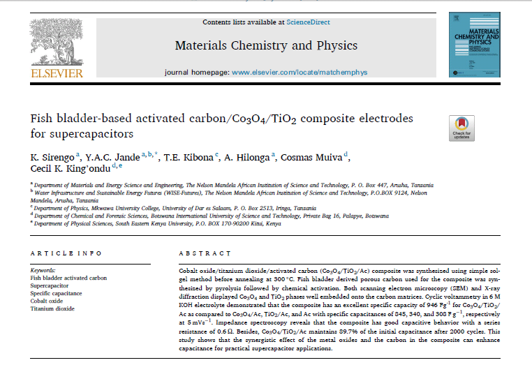 | dc.description.abstract | Cobalt oxide/titanium dioxide/activated carbon (Co3O4/TiO2/Ac) composite was synthesized using simple sol-gel method before annealing at 300 °C. Fish bladder derived porous carbon used for the composite was synthesized by pyrolysis followed by chemical activation. Both scanning electron microscopy (SEM) and X-ray diffraction displayed Co3O4 and TiO2 phases well embedded onto the carbon matrices. Cyclic voltammetry in 6 M KOH electrolyte demonstrated that the composite has an excellent specific capacity of 946 Fg-1 for Co3O4/TiO2/Ac as compared to Co3O4/Ac, TiO2/Ac, and Ac with specific capacitances of 845, 340, and 308 F g−1, respectively at 5 mVs−1. Impedance spectroscopy reveals that the composite has good capacitive behavior with a series resistance of 0.6 Ω. Besides, Co3O4/TiO2/Ac maintains 89.7% of the initial capacitance after 2000 cycles. This study shows that the synergistic effect of the metal oxides and the carbon in the composite can enhance capacitance for practical supercapacitor applications. | en_US |